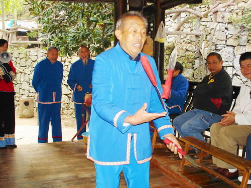 三棒鼓,是以拋三根棒和敲鑼打鼓得名,是土家山寨到處可見的一項以打擊樂器、口頭文學(xué)、表演技藝合為一體的文體活動形式。 打三棒鼓通常由三至五人組成,師傅擊鼓唱詞,一人打鑼,一人;ò、花刀。由一人表演,將鼓架擺在前面鼓架上,將鑼掛在鼓架下面,用細(xì)繩系著鑼棒套在腳板上,表演時,口唱詞、手打鼓、腳踩鑼,鑼鼓節(jié)拍是按拋花棒、花刀速度的需要而定。三棒鼓的唱詞是五言四句重復(fù)半句組成。即五字一句,四句為一節(jié)。每小節(jié)的第四句要重復(fù)半句。每一小節(jié)擊響鑼鼓四遍。前三句是每唱完擊三響,最后一句唱完即每小節(jié)結(jié)束時擊響十下。例如唱:"學(xué)打三棒鼓",打"鏘鏘鏘";唱"學(xué)又學(xué)得苦",打"鏘鏘鏘";唱"三歲學(xué)到一十五",打"鏘鏘鏘";唱"學(xué)起呀,學(xué)起走江湖",打"鏘鏘鏘、鏘、鏘、鏘鏘鏘鏘鏘-鏘"。這一小節(jié),每唱一字為一拍,"鏘"為鑼鼓同鳴聲,每聲占一拍,標(biāo)點符號也占一拍。每拍的快慢取決于花棒下落的速度,任何一個花棒下落一次均為一拍。因此,如果花棒拋得低,下落的頻率就快,每拍所占時間就短,反之,花棒拋得高,每拍占的時間就長。三棒鼓的第二句和第四句都要求壓韻,一句和三句可壓可不壓. 打三棒鼓的技巧性很強,思想要高度集中,拋刀拋棒用力要適度,動作要敏捷準(zhǔn)確,稍有疏忽大意,不但表演失敗,還會被刀劃破手腳或誤傷他人。因此,凡是學(xué)打三棒鼓者,均需經(jīng)常練習(xí)飛拋接技術(shù),做到閉目均能拋接刀棒。因此,土家族青少年經(jīng)常用三個卵石練習(xí)拋接技術(shù),久而久之,熟能生巧,不但會拋棒,而且能拋刀。 打三棒鼓的鑼鼓曲牌不變,但唱詞多種多樣,除了固定的《十二月花》等唱詞外,均為即興編詞隨口而唱,唱三棒鼓歌的人,都是腦筋靈活、口才伶俐者。 |