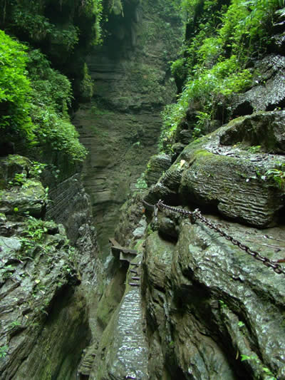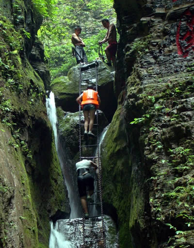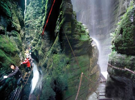 坐龍峽風(fēng)景區(qū) 坐龍峽擁有中國第一條特種游道。所有游道均建于峽谷深處,依山取勢,既經(jīng)細(xì)心雕琢聽卻又渾然天成。粗樸的板栗木棧道,可以讓你零距離的親近那一潭碧幽、聽聞山泉叮咚;精巧的跳墩,可以讓你媳戲流泉、觸感溪瀑;原質(zhì)的石坎道,讓你不得不調(diào)動全部的身心能量悉心攀援、感悟峽谷;有驚無險的鐵梯,讓你伴著腳下轟鳴的溪水,在驚怵中體味一份快慰。出口處的土家山寨,保留了古樸獨特的生活習(xí)俗。一塊臘肉就一口醇香的“苞谷燒”會讓你洗去所有的疲憊,在輕松中憨厚的主人向你講述過去強人出沒的故事......
