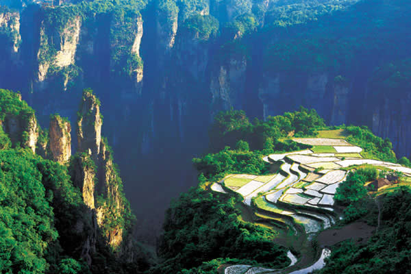 空中田園坐落在天子山莊右側(cè)經(jīng)老虎口、情人路方向兩公里處的土家寨旁,海拔1000余米。它的下面是萬(wàn)丈深淵的幽 谷,幽谷上有高達(dá)數(shù)百米的懸崖峭壁,峭壁上端是一塊有3公頃大的斜坡梯形良田。田園三方峰巒疊翠,林木參天,白云繚繞,活像一幅氣勢(shì)磅礴的山水畫(huà)。登上“空中田園”。清風(fēng)拂袖,云霧裹身,如臨仙境,使人有青峰鳴翠鳥(niǎo),高山響流泉,身在田園里,如上彩云間”之感。