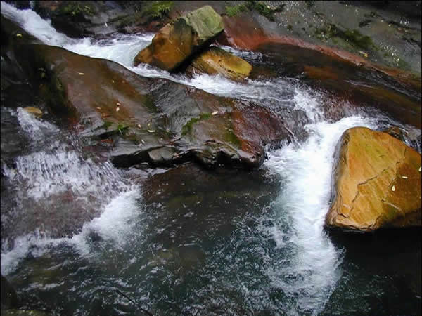 | 紫草潭位于張家界國家森林公園內,金鞭溪與砂刀溝匯合處。潭谷為紫紅色砂巖,因流水經(jīng)多次沖刷成槽狀,而名為紫草潭。潭長約8米,寬約2米,深2米。潭水清澈見底,加之因奇峰、綠樹、紫石映入潭底,斑駁陸離,水光鱗鱗,綠影搖曳,極為自然和諧。潭上小橋為一塊完整的天然巨石,三米多長,二米寬。