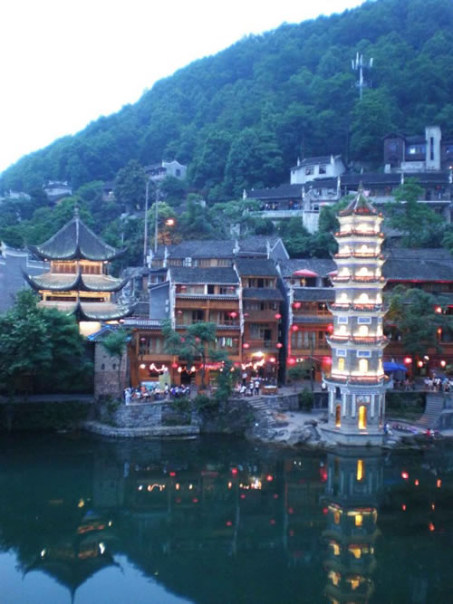 萬(wàn)名塔夜景 為何要修筑這字紙爐,據(jù)說(shuō),乾隆五十年(1876年)古城擴(kuò)建了筆架城以后,形似筆架,故名“筆架城”,有了筆架峰,為培植風(fēng)水,便在沙灣黃土坎江邊修筑字紙爐寶塔一座,象一支筆,與筆架城相對(duì)應(yīng),意欲使鳳凰人文蔚起。
