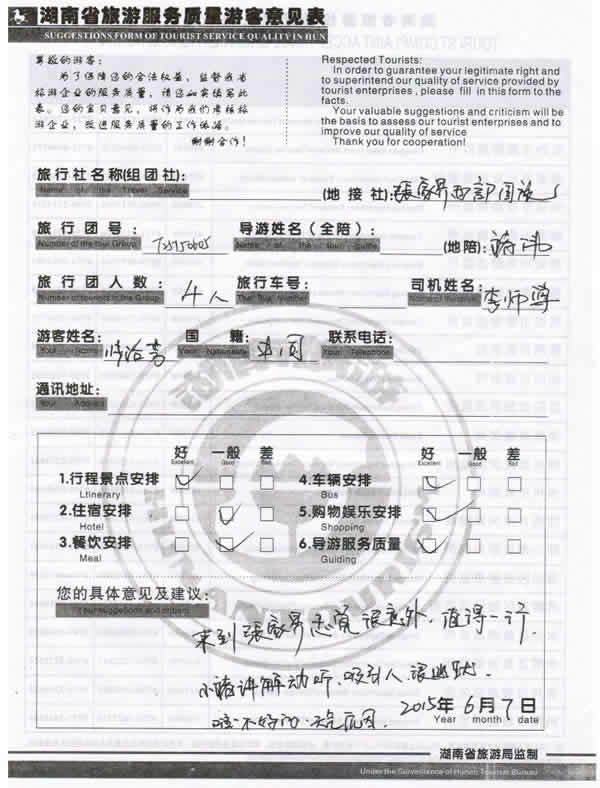 5月下旬,上海張女士一行四位貴賓與湖南西部(張家界)中國國際旅行社工作人員——龔玲取得聯(lián)系,經(jīng)過商談,雙方達(dá)成協(xié)議并簽訂旅游合同,于6月4日抵達(dá)張家界,開始張家界之旅。此次行程是由我社優(yōu)秀導(dǎo)游——褚偉,負(fù)責(zé)旅游接待工作,褚導(dǎo)在旅游過程中講解詳細(xì),客人也很滿意,在意見表上寫到:來到張家界感覺很意外,值得一行,小褚講解動(dòng)聽,吸引人,很幽默!同時(shí)也感謝張女士選擇湖南西部(張家界)中國國際旅行社,以及您對(duì)湖南西部國旅的信任與支持。我們會(huì)繼續(xù)努力,做好旅游接待工作。期待下一次與您的合作,祝您愉快!