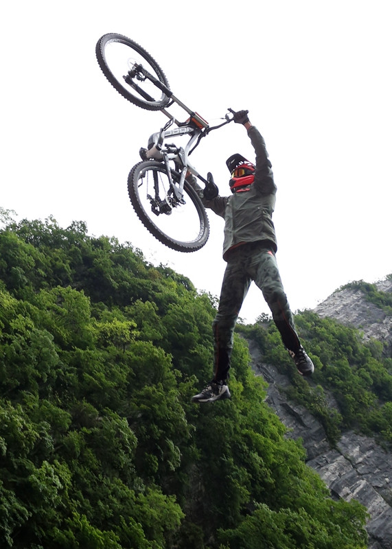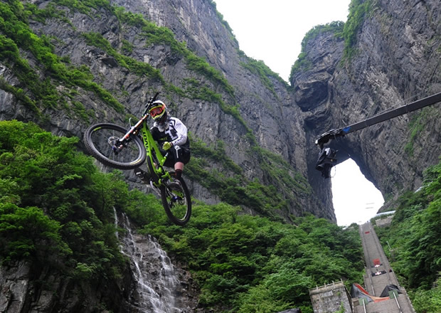 張家界天門山天門洞,999級(jí)臺(tái)階,以39°斜坡筆直往下,看一眼都覺得眩暈。如果有人騎著山地車一路沖下來(lái),你一定會(huì)說(shuō)“瘋了!”。