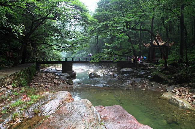 在千里相會東約250米處,有數(shù)十座翠峰環(huán)列鎖住了一塊長200多米、寬30多米的溪谷。谷內群峰排列如屏,鱗次櫛比,相對高多在200米以上,峰體或丹巖熠熠,或灌木叢生,或古松高掛。澗壑幽邃,清溪漫流。內有猴群攀緣,角雉啼鳴,一石擊水,四壁回音。朝陽從峰隙中射入三五道銀光,如一柄柄長劍刺入溪谷老林,光怪陸離。若遇陰雨,霧繞云蓋,一片幻影。