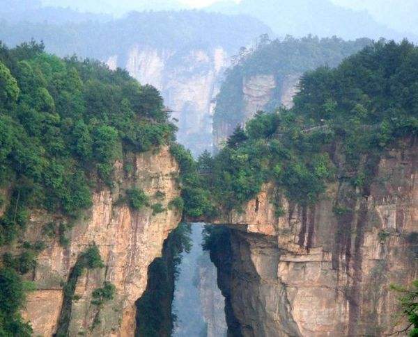 “后花園”至天下第一橋,有一條全長2000多米的游道,路面多為白色的條石鋪成,站在遠處觀望,很像一條白色的綢帶打了兩個結,一頭系在“迷魂臺”,一頭第在“天下第一橋”。信步漫游,沿途可欣賞到“拜仙臺”、“百丈絕壁”、“小洞天”、“情人谷”等別有情趣的景點,這里海拔不高,一般不受氣候影響,慢慢品味,定會使您賞心悅目。“天下第一橋”是張家界“十大絕景”之一。也是袁家界的標志性景點,它是居于兩山之間形成的一座天然石橋,而兩山原為一體,橋身是兩山相連的關鍵部分,但因中間石質較為薄弱,由于風化、崩塌作用的影響,又經(jīng)過日曬雨淋、流水洗刷、山洪沖擊,久而久之,終于形成今天這一特別的奇景……。自杉刀溝上袁家界,沿絕壁頂部邊緣遨游,至于中坪“觀橋臺” 遙望千米之外,只見一天然石橋凌空飛架兩峰之巔,氣勢磅礴,奇?zhèn)ソ^倫,被稱為“天下第一橋”。石橋寬僅3米,厚5米,跨度約50米,相對高度近400米。天下第一橋與夫妻巖并稱“張家界雙絕”!疤煜碌谝粯颉睒蛎鎸拑擅祝袼拿,跨度為二十多米,高度為三百多米,是世界是迄今為止所發(fā)現(xiàn)落差最高的天然石橋。