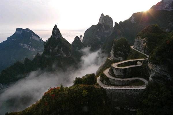 張家界天門山公路非常險峻,比原來通往湘黔要道的矮寨公路還險很多,而且造價非常驚人。整個公路全長約10公里,每米造價約10000元人民幣(約相當于高速公路的單位價格)。故整個天門山盤山公路的造價已超過了1億人民幣。