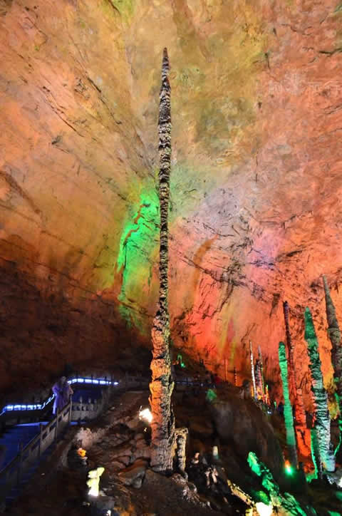 過烏龍泉東行1500米左右,一堵石壁上有一道深4米,高3米,長40多米的凹槽,凹槽上有一直徑約80厘米的洞眼,泉水從中流出。洞內有一狹長露天石槽,高10米許,長2000多米,寬僅0.4米,游人進洞,僅可側行。走完狹槽,復入一洞,高達30多米,寬20余米,長約200米。洞壁、洞頂皆聳立或懸垂著琳瑯滿目的鐘乳石,或大或小,或長或短,淺紅,淡黃,灰白,鐵青,玲現(xiàn)剔透較大的柱狀鐘乳石400多根,均能敲出悅耳的樂音。