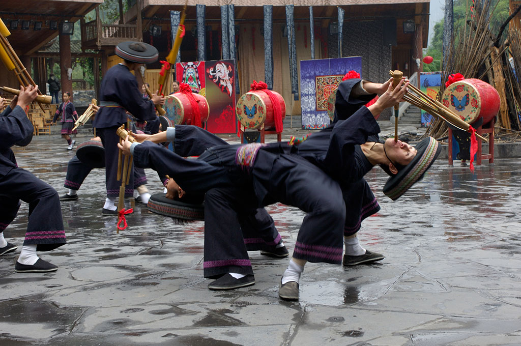 吉首市德夯風(fēng)景區(qū)地處云貴高原邊緣,位于湘西土家族苗族自治州首府吉首市西郊,距吉首市24公里。德夯旅游區(qū)以矮寨為中心,東到堂樂洞、西到大龍洞,南從武山、蓮臺山開始,北到流紗瀑布(全國落差最高的流紗瀑布和瀑布群),小龍洞,總面積約190平方公里。自矮寨鎮(zhèn)洞溪上行4公里至德夯苗寨,沿岸筒車、水輾、古渡、小舟,伴以苗家吊腳樓,一派田園詩情。九龍溪穿寨而過,四周山色清幽,懸崖如削......在青山綠水間,點綴著一幢幢灰瓦石基吊腳樓,一條條光滑的石板路,一座座精巧的石拱橋,一群群赤足紅裝的浣紗苗女。還有那古老的石碾和筒車,在水力的帶動下,咕咕嚕嚕、咿咿呀呀,不知疲倦地旋轉(zhuǎn)著,一派田園詩情,這就是德夯苗寨。由于這里是純苗區(qū),苗族人民的風(fēng)俗習(xí)慣對德夯影響很大,苗族人民的四月八、跳鼓舞、三月三歌會、趕秋、接龍、推牛以及苗嶺情歌,無不吸引著中外游客。因此,古樸優(yōu)雅的苗族風(fēng)情又成為德夯人為景觀的特色。